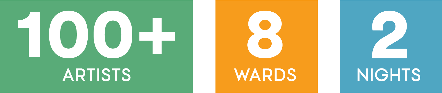 The festival hosts different activations each night, bringing visual and performing arts, including painting, photography, sculpture, crafts, fashion, music, dance, theater, film, and poetry, to indoor and outdoor public and private spaces, including local businesses and restaurants.